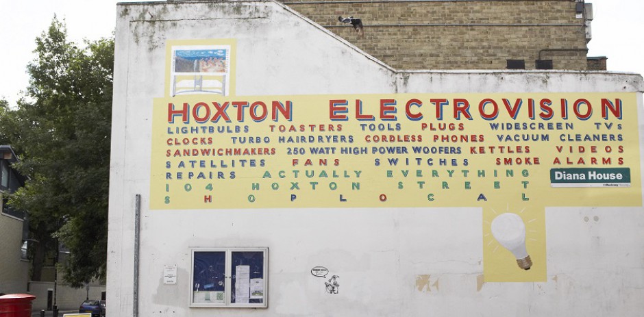 Hoxton Street is the backbone of Shoreditch and boasts a huge variety of shops and stalls that sell everything from jellied eels to electrical goods. Many of the shops are established family enterprises that battle to make a profit while having to compete with the well-known high street brands. Specially commissioned for public sites in Shoreditch, internationally acclaimed artists Bob and Roberta Smith designed one-off advertisements for five businesses along Hoxton Street.